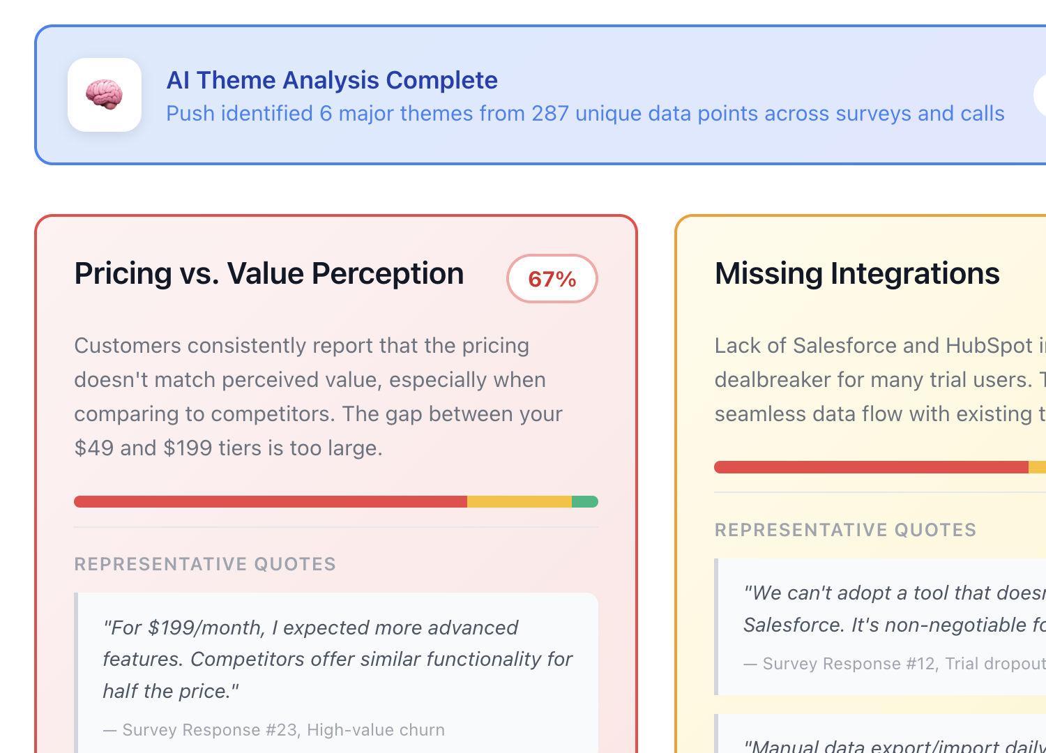 Push is built for data-driven startups, growth teams, and product leaders who need to understand customers but lack bandwidth for consistent research. If you have 500+ users and basic analytics, you're ready.